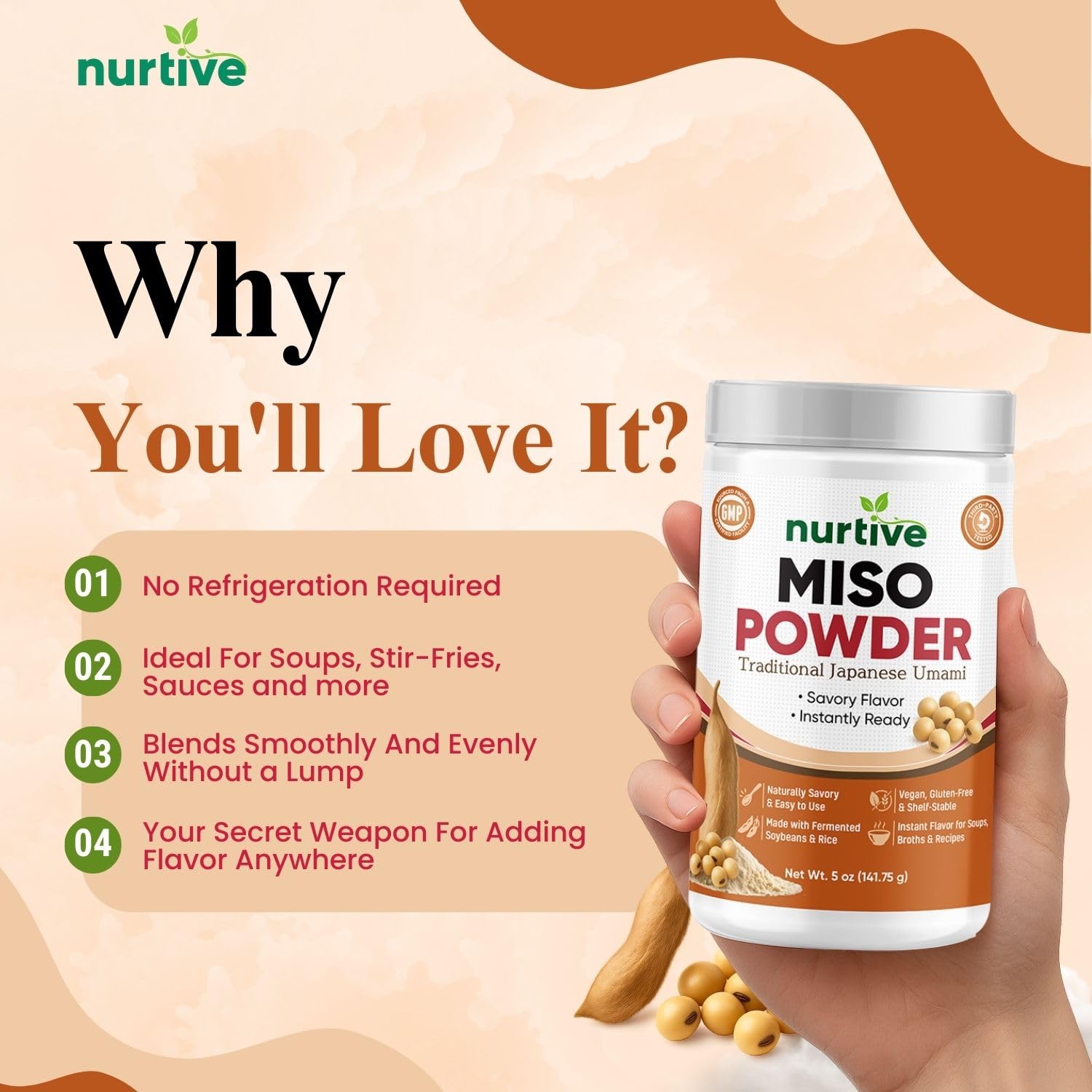 - ๐ช๐ต๐ ๐ฃ๐ผ๐๐ฑ๐ฒ๐ฟ ๐๐ฒ๐ฎ๐๐ ๐ฃ๐ฎ๐๐๐ฒ โ ๐ก๐ผ ๐๐ฟ๐ถ๐ฑ๐ด๐ฒ, ๐ก๐ผ ๐ฆ๐๐ถ๐ฐ๐ธ๐ ๐ ๐ฒ๐๐: Say goodbye to refrigeration and the hassle of messy miso paste. Nurtive Miso Powder is clean, dry, and shelf-stable โ it stays fresh without spoiling, and there's no need to dig into a sticky container. Whether youโre cooking at home or on the go, this powder format makes enjoying rich, traditional miso flavor easier and cleaner than ever